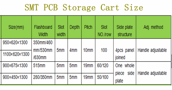 SMT PCB Storage Cart feature is shown in table below,and Price ranges from USD100 to USD500.