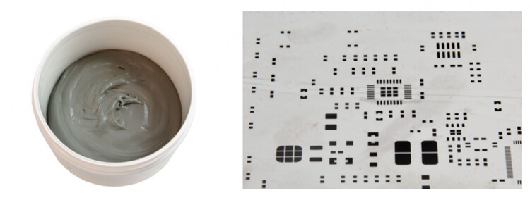 Solder paste (left), PCB stencil laser-cut holes (right)