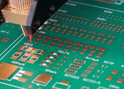The first step in PCB assembly is the application of solder paste onto the board. Solder paste is a gray-colored goo made from a mixture of tiny particles of metal alloys; usually of tin, lead and silver. Think of it as a glue that will hold your completed board together. Without it, components wouldn’t stick to your bare board.