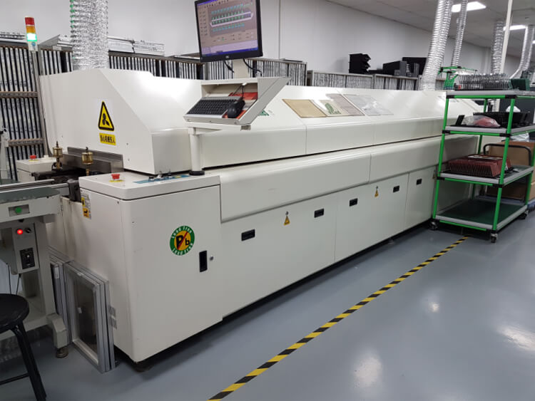 Reflow soldering is the most widely used soldering technique for PCB assembly. Once the board is fully populated with components, the assembly is moved along a conveyor, through a long, giant oven called the reflow soldering machine. The PCB boards travel through various zones at carefully controlled temperatures, so that the solder paste melts and hardens steadily to form strong electrical connections between the components and their respective pads.